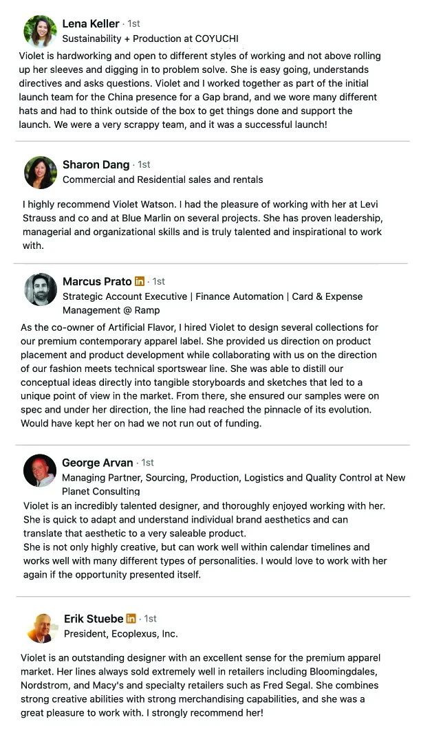 See what people say about working with me, Violet Watson De Leon. I have design experience working with contemporary brands-think casual brands on sites such as Shopbop.com, direct-to-consumer, the casual floor at Bloomingdales, Fred Segal, and your favorite neighborhood boutique. Also, I launched a sustainable, eco-friendly brand. Plus, I have design experience working with mass-market brands such as Levi’s, The North Face & others.
